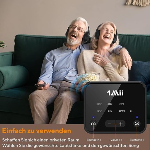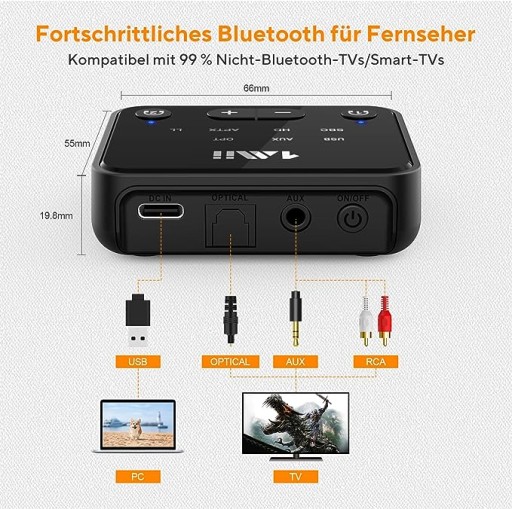 - Bluetooth 5.2 Adapter Bluetooth 1Mii B06T6 do telewizora, najnowsza technologia Bluetooth 5.2, zapewnia bardziej stabilne i niezawodne połączenie. Wystarczy podłączyć go do urządzeń innych niż Bluetooth, takich jak telewizory, komputery i projektory, za pośrednictwem gniazd USB/Opt/AUX/RCA i przesyłać strumieniowo dźwięk do słuchawek/głośników Bluetooth.