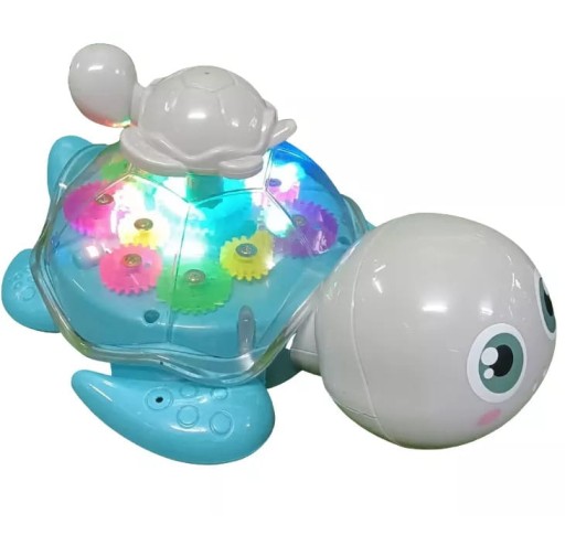 - Wesoły żółwik posiada przezroczystą skorupkę, w której umieszczone są kolorowe koła zębate - podczas zabawy koła kręcą się, a wnętrze żółwika mieni się barwnymi światełkami