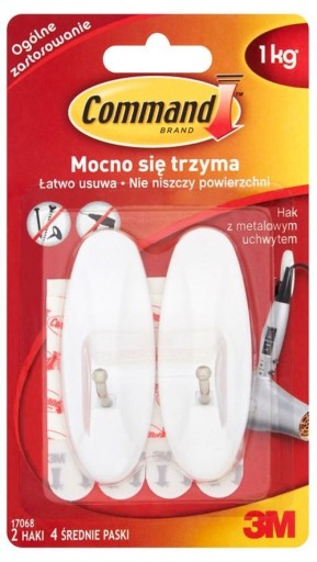 Zapomnij o gwoździach, śrubokrętach czy wiertarkach z command™ haczyki można łatwo i szybko zamontować do zastosowania ogólnego mocno się trzyma, łatwo usuwa nie niszczy powierzchni dopuszczalne obciążenie do 1 kg na 1 pasek w opakowaniu 2 haki i 4 średnie paski kolor: biały