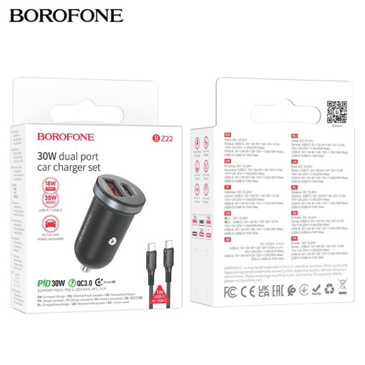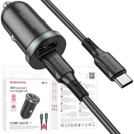 BOROFONE BZ22 to szybka ładowarka samochodowa z jednym portem USB Type-C / Typ C / Typu C / USB-C, o mocy wyjściowej 30W, w standardzie Power Delivery / PD i drugim portem w standardzie USB-A o mocy wyjściowej 18W w standardzie Quick Charge 3.0 / QC3.0. Minimalistyczny design, szeroki zakres napięć i duże możliwości ładowania różnych urządzeń mobilnych to jej główne i niepodważalne zalety. Ładowarka jest kompatybilna z urządzeniami marki Apple oraz Samsung jak i z innymi posiadającymi złącze USB Type-C / Typ C. Zestaw zawiera kabel USB Power Delivery / PD Type-C / Typ C + Typ Typu C / USB-C / Type-C.