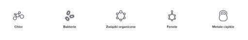 Usuwa z wody wodociągowej wszelkie zanieczyszczenia, w tym m.in.: chlor, związki organiczne, metale ciężkie, fenol, bakterie.