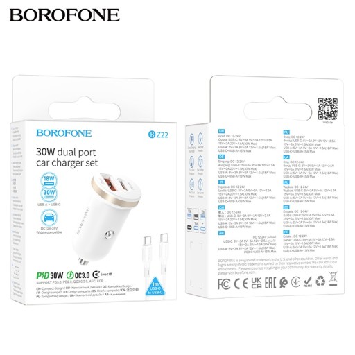 BOROFONE BZ22 to szybka ładowarka samochodowa z jednym portem USB Type-C / Typ C / Typu C / USB-C, o mocy wyjściowej 30W, w standardzie Power Delivery / PD i drugim portem w standardzie USB-A o mocy wyjściowej 18W w standardzie Quick Charge 3.0 / QC3.0. Minimalistyczny design, szeroki zakres napięć i duże możliwości ładowania różnych urządzeń mobilnych to jej główne i niepodważalne zalety. Ładowarka jest kompatybilna z urządzeniami marki Apple oraz Samsung jak i z innymi posiadającymi złącze USB Type-C / Typ C. Zestaw zawiera kabel USB Power Delivery / PD Type-C / Typ C + Typ Typu C / USB-C / Type-C.