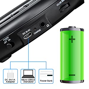 Przedstawiamy przenośny odtwarzacz CD z wbudowanym potężnym akumulatorem litowym o pojemności 1400 mAh. Teraz możesz cieszyć się długimi godzinami odtwarzania bez konieczności ciągłego ładowania. Wygodnie naładuj go za pomocą adaptera DC 5 V/1 A, Power Banku lub komputera, korzystając z dołączonego kabla ładowania. Dzięki pełnemu naładowaniu bateria utrzymuje działanie głośnika przez 7 godzin lub słuchawek przez 10 godzin! Nie musisz się martwić o używanie baterii AA ani o ciągłe podłączanie do odtwarzacza ładowarki. Ciesz się swobodą i długotrwałym odtwarzaniem gdziekolwiek jesteś!