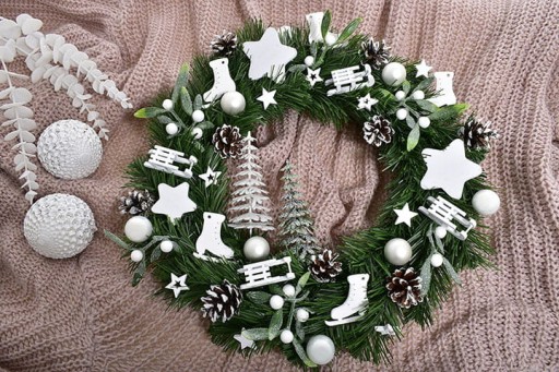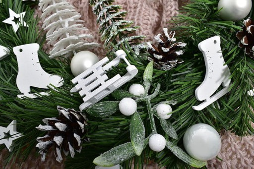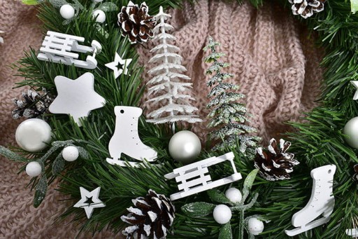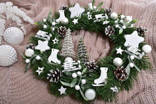 ✅Stroik misternie udekorowany w białe, drewniane elementy takie jak sanki oraz mniejsze i większe gwiazdki, które nadają mu rustykalnego uroku.