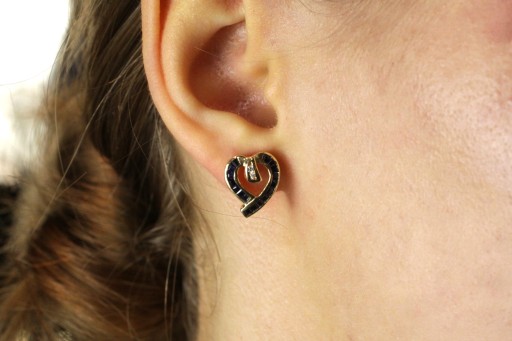 Kolczyki Vintage z żółtego złota z 4 diamentami i 34 szafirami. DIAMENT odmładza, dodaje energii, sił, odwagi, przynosi radość, szczęście. SZAFIR zwany władcą klejnotów przerasta wszystkie inne kamienie. Najskuteczniejsze lekarstwo przeciw truciźnie, ucisza wzburzone nerwy, gasi gorączkę. Daje pogodę ducha. Jest talizmanem mędrców i zakochanych.