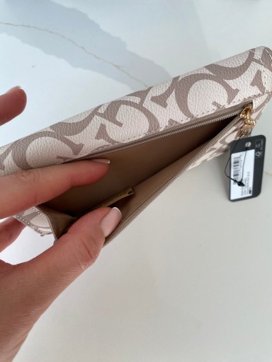 W kolorze kremowym z szarą marka oraz złotym logo. Idealny na prezent, na żywo prezentuje się imponująco. Zgrabny i kobiecy , pomieści bardzo dużo kart , zdjęcie i bilon.