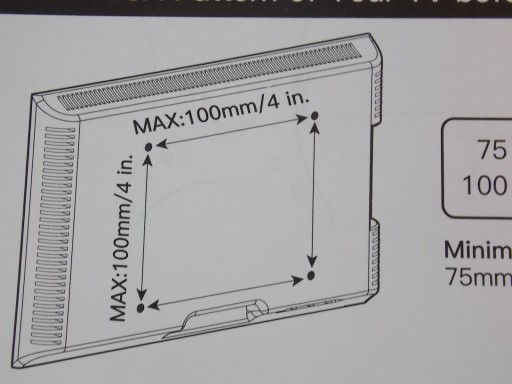 Twój telewizor powinien mieć cztery otwory montażowe na tylnym panelu. Odległość pozioma x pionowa między otworami (w mm) to wzór VESA. Ten uchwyt jest kompatybilny z 100x100, 75x75 i 50x50.