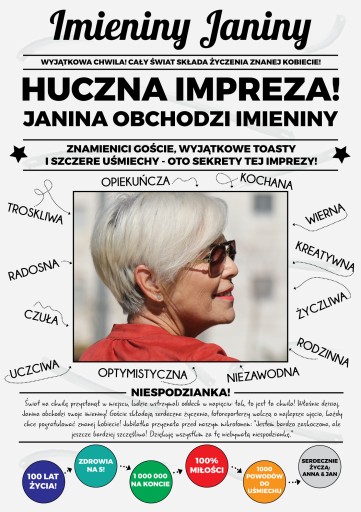 Świetny i oryginalny prezent na imieniny, czyli okolicznościowa gazeta z imieniem i zdjęciem. Wokół fotografii rozmieszczone są pozytywne cechy tej osoby (można je zmienić).