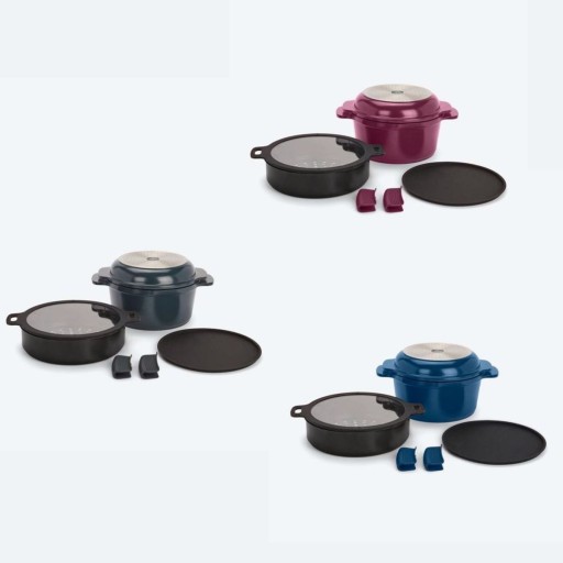 Ten praktyczny i oszczędzający miejsce zestaw składa się z 7 części: garnka, patelni, naczynia do gotowania na parze, uniwersalnej pokrywki, silikonowej poduszki i 2 silikonowych uchwytów.
