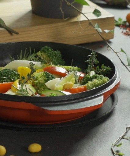 Dzięki tej kombinacji możesz gotować, dusić lub gotować jedzenie (z pokrywką lub bez), możesz piec mięso, piec zapiekanki i ciasta. A szklanej pokrywy możesz użyć jako podstawki lub deski do krojenia.