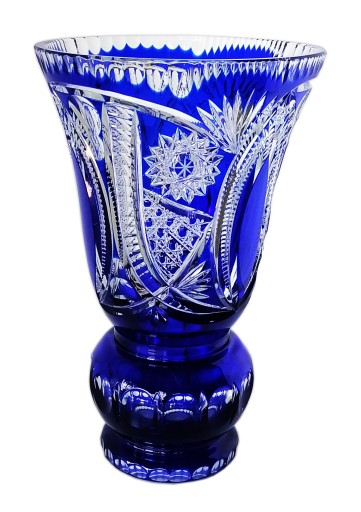 Wyjątkowo elegancki, kryształowy, niebieski wazon. Wykonany jest ręcznie, od uformowania kształtu do uzyskania pięknych wzorów. Wazon wykonany jest z najwyższej jakości szkła kryształowego 24% Pbo.