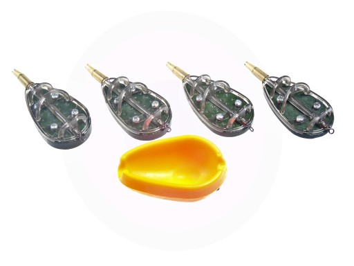 Komplet czterech koszyczków zanętowych wraz z foremką do ich napełniania. Koszyczki mają konstrukcję przelotową. Koszyczki te zawsze układają się na dnie ciężarkiem do dołu i pozwalają na doskonałą ekspozycję przynęty.Koszyczki nie plączą się podczas zarzutu