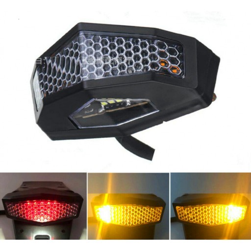 LAMPA UNIWERSALNA NA TYŁ LED Z KIERUNKOWSKAZAMI , STOPEM I PODŚWIETLENIEM REJESTRACJI ,WYKONANA Z TWORZYWA . WYMIARY PODANE NA ZDJĘCIU.DOSTĘPNA Z KLOSZEM PRZYCIEMNIONYM