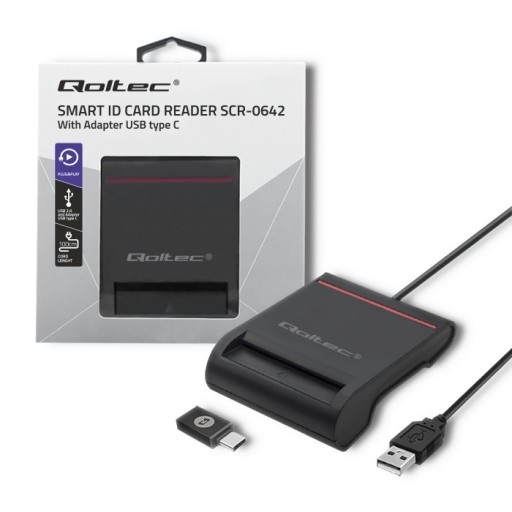 Qoltec Inteligentny czytnik chipowych kart ID SCR-0642 | USB 2.0 + Adapter USB typ C