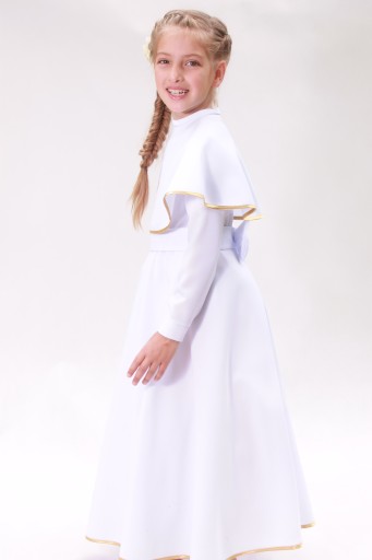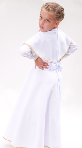 ALBA komunijna dziewczęca długa firmy SOMIR ze złotymi dodatkami w rozmiarze 164 XXL - oferta dla dziewczynki o mocno rozbudowanej sylwetce.