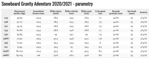 długość 154 cm, szerokość waist 24,6 cm, szerokość tail/nose 28,8 cm, promień 7,7 m, efektywna krawędź 115,5 cm, ciężar osób 60-80 kg