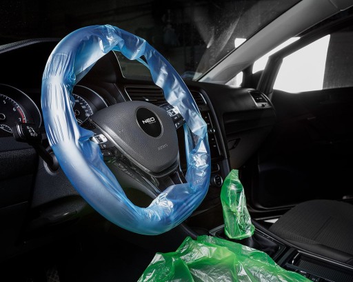 Pokrowiec ochronny folia ECO 5w1 (fotel, kierownica, dźwignia zmiany biegów, ręczny, dywanik) 200 sztuk 10-485 marki NEO to zestaw 200 sztuk pokrowca, zapewniający ochronę takim elementom wyposażenia samochodu jak fotel, kierownica, wycieraczka, dźwignia zmiany biegów, hamulec ręczny czy dywanik. Produkt wykonany został z folii w ponad 50% pochodzącej z recyklingu oraz biodegradowalnej, co korzystnie wpływa na środowisko. Oferuje pokrycie siedzenia o wymiarach 880 x 1500 mm, wycieraczki – 510 x 700 mm oraz kierownicy – 490 z 150 mm. To antypoślizgowy pokrowiec, który umożliwia pewny i stabilny chwyt. Produkt odporny jest na rozdarcia i polecany do wielokrotnego stosowania. W zestawie znajduje się specjalna, niebieska folia na kierownicę, charakteryzująca się wysoką rozciągliwością, elastycznie dopasowująca się do kształtu kierownicy. Pokrowiec marki NEO zapewnia ochronę poszczególnych elementów wnętrza samochodu przez ubrudzeniem lub zarysowaniem. Dobrze sprawdzi się w warsztatach samochodowych przy naprawie aut, w salonach i komiksach samochodowych oraz w detailingu.