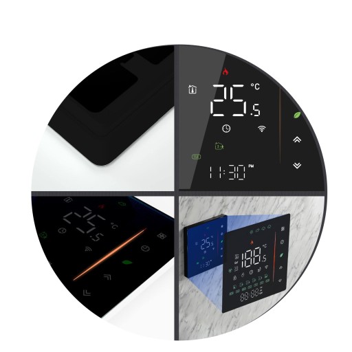 Bezramkowe i bezokienkowe sterowanie dotykowe: niesamowity nowy, miękki w dotyku projekt z efektem łuku 2,5D na krawędzi obiektywu i kolorowym wyświetlaczem LED, wygląda jak piękna sceneria, a ukryty przycisk dotykowy w dużym stopniu upraszcza interfejs użytkownika. Ultracienki wbudowany panel doskonale pasuje do wszystkich rodzajów ścian, ze standardowymi kasetami kwadratowymi 86 mm i kasetami europejskimi 60 mm, aby sprostać wszystkim środowiskom instalacyjnym; Dokładność ±1 ℃ utrzymuje temperaturę na ustawionym poziomie.