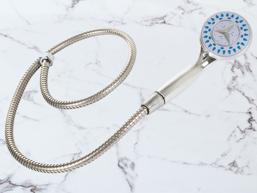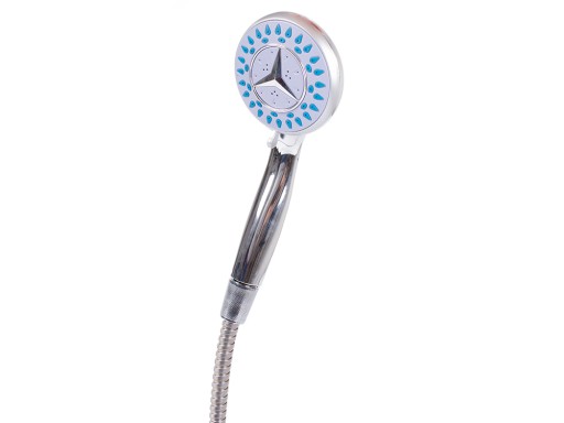 Trzyfunkcyjna słuchawka prysznicowa z gumowymi wypustkami oraz długim wężem, doskonale nadaje się do wanny czy kabiny prysznicowej.