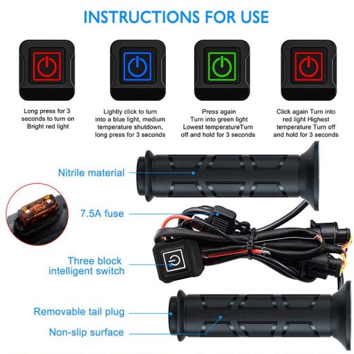 Sterownik mocowany pod lusterko, nie musisz szukać wolnego miejsca na kierownicy, 3 stopnie grzania 40, 50, 60 stopni. Podgrzewany kciuk z taśmą 3M i opaską termokurczliwą