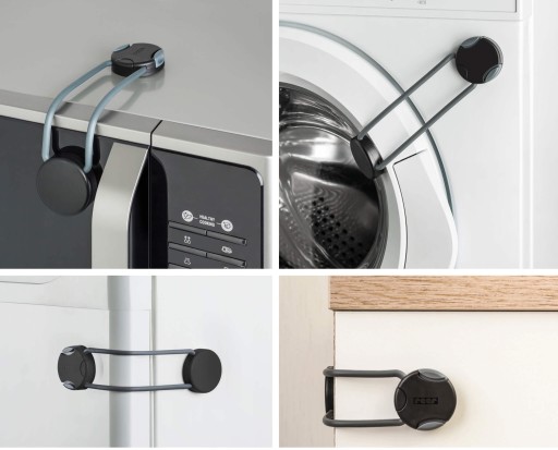 Zabezpiecza przed dziećmi szafy szuflady, skrzynki, lodówki, pralki i kuchenki mikrofalowe