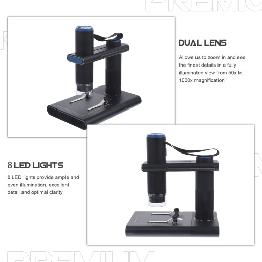 ✅Podwójny obiektyw cyfrowy/mikrobiologiczny: pozwala nam powiększać i widzieć najdrobniejsze szczegóły w całkowicie oświetlonym widoku od powiększenia 50x do 1000x.