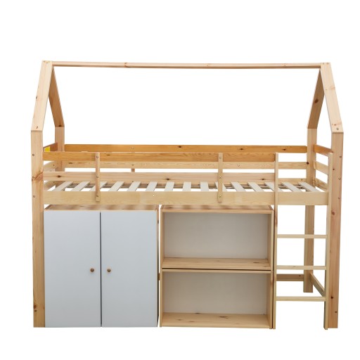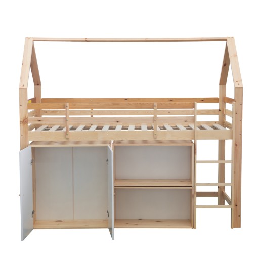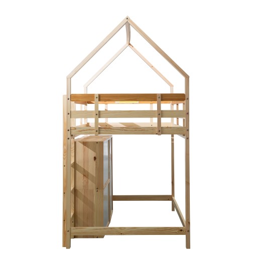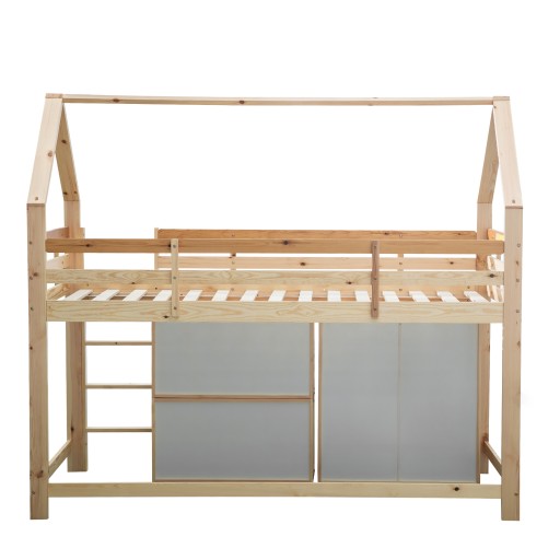 Łóżko domek w naturalnym kolorze zapewnia nie tylko wygodne miejsce do spania, ale także kreatywny i organizacyjny element pokoju dziecięcego. Szafki i półki, które można dowolnie ustawiać, są praktyczne w pokoju dziecięcym i utrzymują w nim porządek. Połączenie naturalnych i białych odcieni nadaje łóżku ponadczasową elegancję i ciepłą, zachęcającą atmosferę w pomieszczeniu.