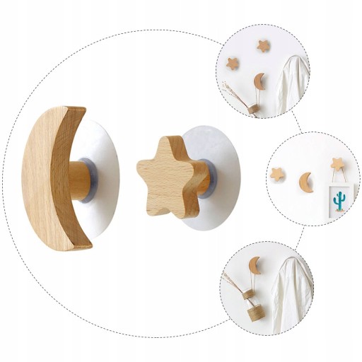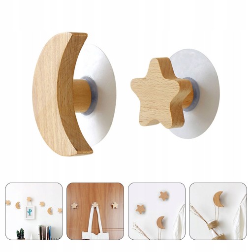 Ten przedmiot zawiera dwa ozdobne drewniane haczyki w kształcie księżyca i gwiazdy, które są wykonane z trwałych materiałów,