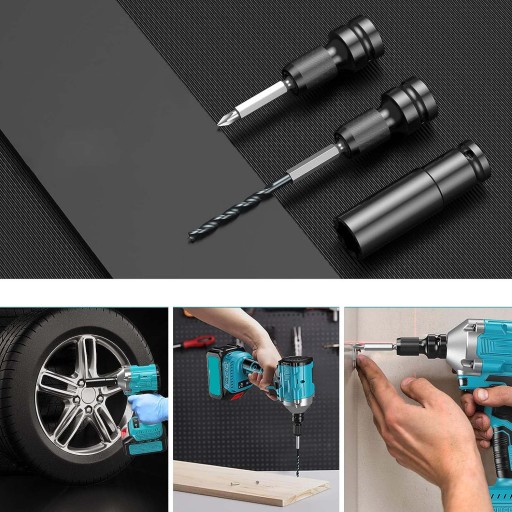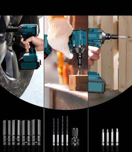 - Elektryczny klucz udarowy Uaoaii jest wyposażony w 4 sztuki nasadek udarowych (17 mm/19 mm/21 mm/23 mm), 4 sztuki wiertarek udarowych i 4 sztuki śrub udarowych.