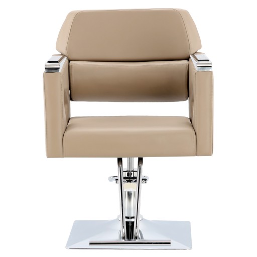Fotel charakteryzuje się eleganckim i ergonomicznym designem, który pozwala na wygodną pracę fryzjera oraz relaks klientów.