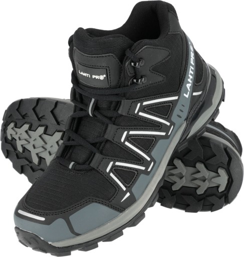 Trzewikirobocze męskie Lahti Pro model L30124 wykonano z wodoodpornej dzianiny typu rip-stop. Podszewka która jest jednym z ważniejszych elementów w bucie ze względu na bezpośredni kontakt ze stopą wykonana jest z dzianiny siatkowej. Wyściółka buta roboczego zwana potocznie wkładką jest wymienna. Gumowa podeszwa o właściwościach antypoślizgowych na podłożu ceramicznym - norma bezpieczeństwa O2 - oraz głęboki protektor o nowoczesnej linii wzorniczej zapewniają wysoką stabilność obuwia i podnoszą komfort użytkowania. Półbuty robocze męskie o modelu L30124 posiadają właściwości antyelektrostatyczne. Zgodnie z normą SRA półbuty robocze mają zabudowaną piętę, ograniczoną przepuszczalność i absorpcję wody oraz absorpcje energii w części piętowej. Dodatkowo buty wyposażone są w elementy odblaskowe poprawiające widoczność. Obuwie posiada kategorię bezpieczeństwa O2 SRA i spełniają postanowienia normy EN ISO 20347:2011. Półbuty robocze Lahti Pro L30124 posiadają deklarację CE, obuwie jest w drugiej kategorii środków ochrony indywidualnej.