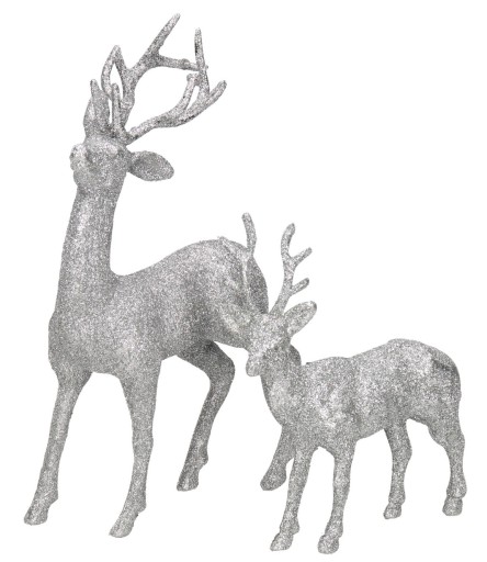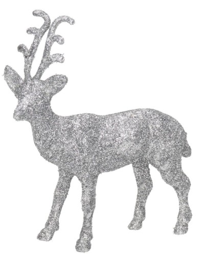 Wymiary tego uroczego renifera to: 13 cm (wysokość), 10,5 cm (długość), a grubość wynosi około 2,2 cm. Ten srebrny renifer z brokatem jest sprzedawany jako pojedyncza sztuka.
