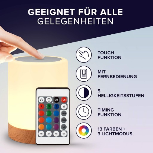 【Czuły dotyk】 W porównaniu z tradycyjnymi dotykowymi lampkami nocnymi czułość jest o 30% wyższa. Dzięki lampce nocnej możesz łatwo znaleźć najbardziej odpowiednią atmosferę oświetleniową. Za pomocą touchpada możesz włączać/wyłączać światło, wybierać 10 kolorów, 4 tryby oświetlenia, planować i regulować jasność.