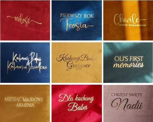 - W przypadku wyboru czarnych kart, kolor pierwszej karty, na której widnieje dedykacja jest dopasowywany względem koloru weluru np. album czerwony welur z czarnym kartami będzie miał pierwszą kartę koloru czerwonego, na niej będzie nadrukowana dedykacja w kolorze czarnym.