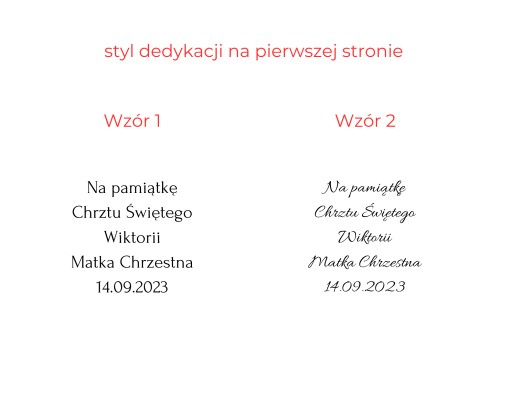 Jeśli tak, wpisz tekst dedykacji na pierwszej karcie oraz wzór czcionki, którą wykonana zostanie dedykacja np. Kochanej Ani w dniu pierwszych urodzin Babcia Krysia i Dziadek Jurek , wzór 2