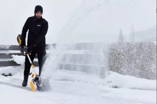 ✅Wygodna i komfortowa, akumulatorowa łopata do odśnieżania bezproblemowo usuwa śnieg z podjazdów, tarasów i schodów o głębokości do 15 cm.