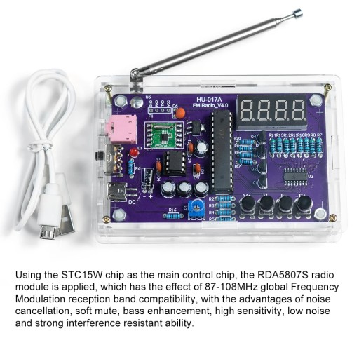 🍀Używając układu STC15W jako głównego układu sterującego, zastosowano moduł radiowy RDA5807S, który zapewnia kompatybilność pasma odbioru modulacji częstotliwości 87-108MHz, z zaletami redukcji szumów, miękkiego wyciszania, wzmocnienia basów, wysokiej czułości , niski poziom hałasu i odporność na zakłócenia b.