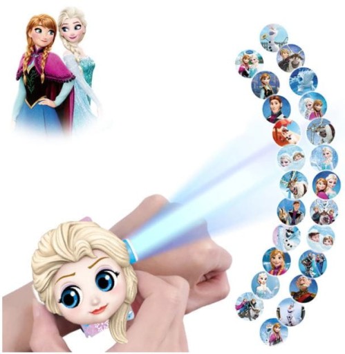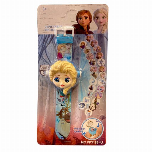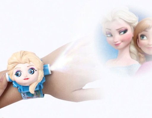 PO NACIŚNIĘCIU PRZYCISKU Z LEWEJ STRONY ŚWIECI DIODA Z PRAWEJ STRONY ZEGARKA WYŚWIETLAJĄC RÓŻNE OBRAZKI i POSTACI Z KRAINY LODU !