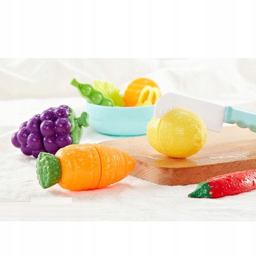 Cześć warzyw jest łączona na rzepy. Dziecko może kroić je plastikowym nożykiem a następnie ponownie połączyć.