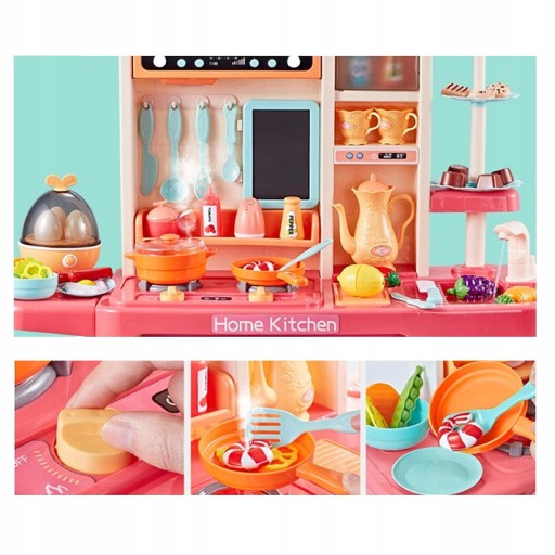 ZIMNA PARA, DŹWIĘKI PODCZAS GOTOWANIA, WODA – kuchnia emituje realistyczne dźwięki i odgłosy znane podczas gotowania, takie jak smażenie, oraz bulgotanie. Lewy palnik posiada wbudowany parownik, który pozwala na uzyskanie efektu "zimnej pary". Aby go uzyskać należy wlać około 50ml wody do otworu znajdującego się na palniku. Postawić garnek, a po pewnym czasie (jak już 'woda się zagotuje') z garnków wydobędzie się zimna para wodna. W kuchni zastosowano kran, który posiada pompkę. Wystarczy wlać do zlewu wodę, nacisnąć pompkę, a z kranu wyleci woda! Jest to obieg zamknięty. Dziecko może opłukać owoce, warzywa, a także pozmywać naczynia! Wszystkie funkcje wzbudzają zainteresowanie dzieci i zachęcają do zabawy.