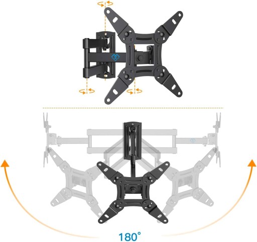Optymalny Kąt Widzenia – Ten uchwyt ścienny do telewizora oferuje kąt nachylenia +5° / -15°, kąt obrotu +/- 180° (maksymalny kąt obrotu zależy od rozmiaru telewizora) i regulację obrót +/- 360°elastyczności widzenia i personalizacji swych wyjątkowych wrażeń z oglądania.