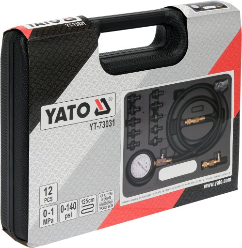 - Zawartość zestawu: miernik, wąż, adapter x10 (R1/8 DIN 2999, 1/8" 27 NPT, 1/4" 18 NPT, 3/8" 20 UNF, 1/2" 20 UNF, M10 x 1.0, M12 x 1.5, M14 x 1.5, M16 x 1.5, M18 x 1.5)