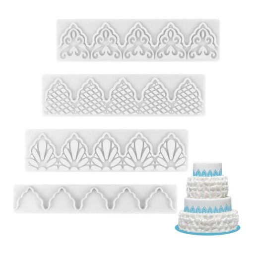 Zestaw 4 foremek plastikowych do odciskania i wycinania koronek z plastycznych mas cukrowych w „stylu angielskim”.