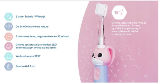 Pozwala na łatwiejsze i bardziej precyzyjne czyszczenie zębów, zwłaszcza w przypadku dzieci w młodszym wieku. To ważne, aby początkujący użytkownicy szczoteczek do zębów otrzymywali odpowiednie wsparcie przy myciu zębów, aby proces ten był jak najskuteczniejszy i najbezpieczniejszy. Główka Vitammy Bunny została odchylona o 15 stopni, dlatego rodzic w łatwy sposób może pomóc maluszkowi w szczotkowaniu