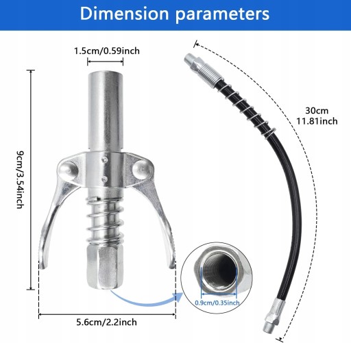 Kompatybilny ze wszystkimi smarownicami z przyłączem 1/8" NPT. Przystawka do smarownicy jest odpowiednia dla wszystkich baterii 1/8" NPT, pneumatycznych, ręcznych smarownic i złączek Zerk, pasuje również do wszystkich smarownic DIN i SAE. Ulepszona szczęka może pracować pod wysokim ciśnieniem bez deformacji.