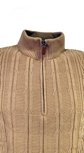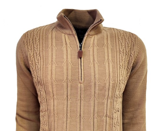 Wykonany z najwyższej jakości kaszmiru zapewni wysoki komfort użytkowania nawet w chłodniejsze dni. Krój typu regular będzie pasował do każdego typu męskiej sylwetki. Sweter jest zakończony golfem zapinanym na suwak oraz ściągaczami przy rękawach. Ciekawa struktura tkaniny czyni sweter oryginalnym.