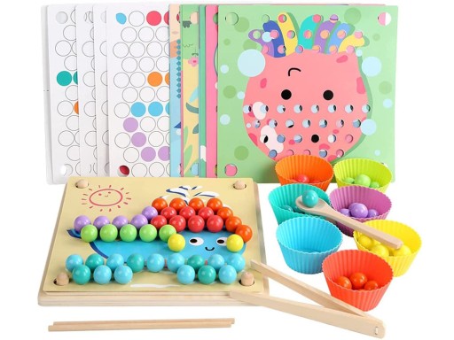 - poprawia zdolności poznawcze - dzięki układaniu koralików w różne wzory, dziecko rozwija zdolności poznawcze, takie jak rozpoznawanie kolorów, kształtów, wzorów i liczenia