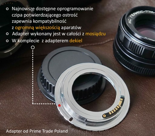 Adapter na obiektywy M42 (gwint 42 mm) do aparatów, lustrzanek Canon EOS z bagnetem EF i EF-S (wszystkie współczesne lustrzanki marki Canon) . Adapter posiada czip tzw. dandalion z wgranym fabrycznie najnowszym oprogramowaniem dostępnym na rynku. Jest to najbardziej uniwersalne oprogramowanie działające z największą liczbą aparatów. Czip jest w wersji programowalnej co oznacza, że wartości przysłony i ogniskowej możemy w przeciwieństwie do zwykłego adaptera z potwierdzeniem dowolnie zmieniać, możemy też ustawić ew. korekcję tak aby nasz aparat ostrzył idealnie "w punkt". Jest to najprecyzyjniej wykonany adaptery na rynku. Posiada blokadę bolca przysłony pozwalającą na bezproblemową współpracę z obiektywem M42 niezależnie od tego czy obiektyw posiada przełącznik A/M czy nie.