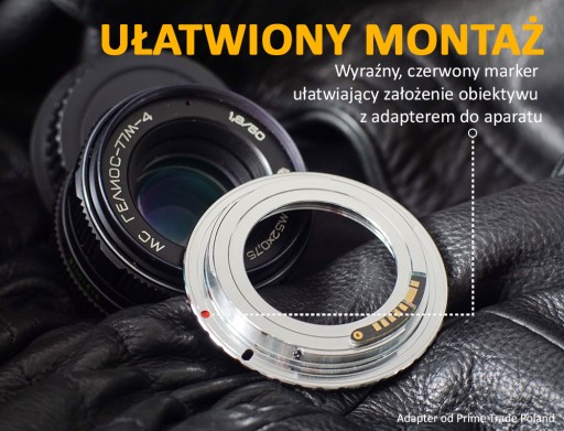 - Adapter został wyposażony w blokadę bolca przysłony co oznacza możliwość ustawiania przysłony również na obiektywach nie posiadających przełącznika A/M