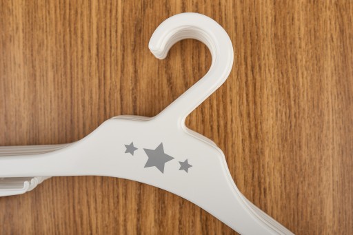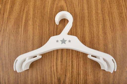 Małe wieszaki dziecięce,niemowlęce na ubranka.Zestaw składa się z 8sztuk.Wieszaki są kolorze białym z szarymi gwiazdkami.